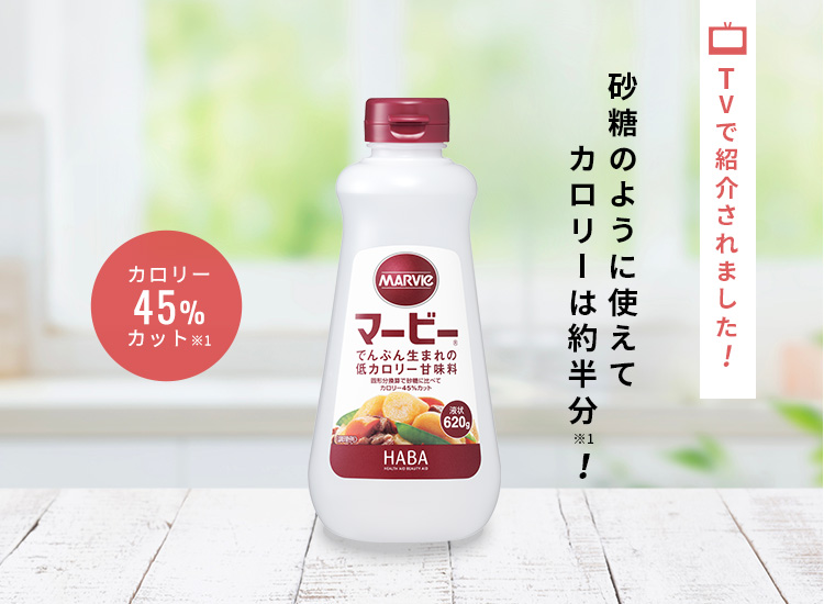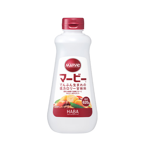 マービーとは、でんぷんから作られた還元麦芽糖100%の低カロリーの糖質のこと。砂糖やブドウ糖に比べてカロリーが約半分と低いのに、きちんと甘みがあって美味しい甘味料です。