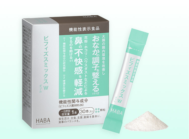 [届出表示]本品には生きたビフィズス菌BB536が含まれます。ビフィズス菌BB536には、大腸の腸内環境を改善し、おなかの調子を整える(便通を改善する)機能や、花粉、ホコリ、ハウスダストなどによる鼻の不快感を軽減する機能が報告されています。