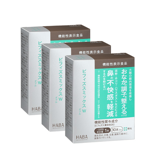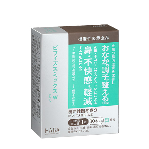ビフィズスミックスW(ダブル)は、ビフィズス菌BB536をはじめ3種の乳酸菌をバランスよく配合。ビフィズス菌BB536はもともとヒトの腸内に存在し、酸に強いという特性があるので、生きたまま大腸に届き腸内環境を改善。さらに細胞バランス*1を整え鼻の不快感を軽減するというW(ダブル)の機能!健康な腸内環境で、すっきり軽やかな毎日に!