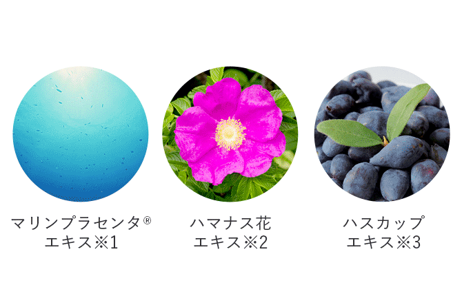 ※1 皮膚コンディショニング成分:加水分解サケ卵巣膜エキス ※2 保湿成分※3 保湿成分:ロニセラカエルレア果汁
