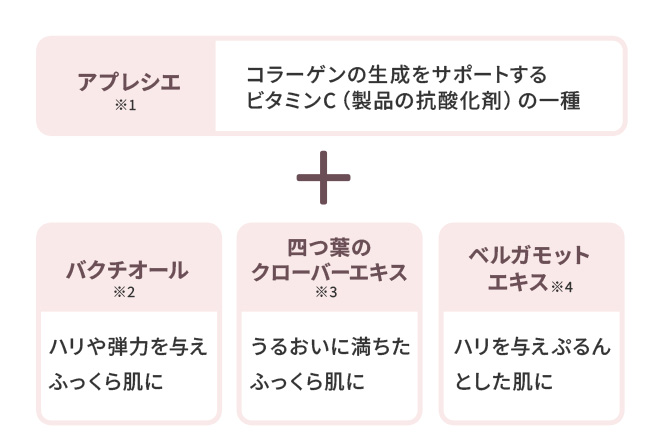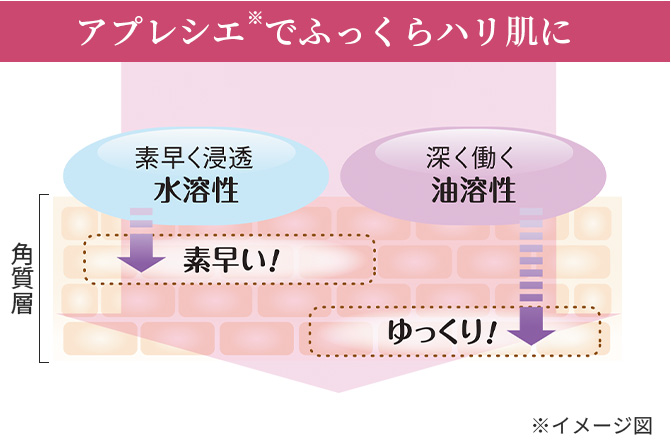 素早くなじむ水溶性と深く働く油溶性の性質を併せ持ったビタミンC(製品の抗酸化剤)の一種「アプレシエ」を配合。角質層まで素早く浸透して働き、ハリの低下をサポートします。