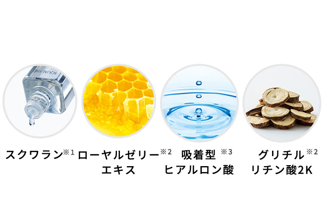 保湿成分スクワランやローヤルゼリーエキス*2、グリチルリチン酸2K*2や吸着型ヒアルロン酸*3を配合。しっとりと、キメの整ったモチモチ肌に導きます。