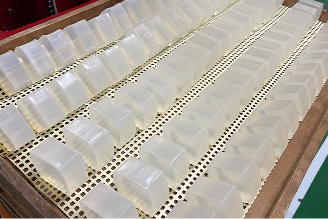 手間ひまがかかる枠練り製法でつくられているのも、スクワフェイシャルソープの特長のひとつ。商品が完成するまでに熟成(乾燥)を含めて50~60日を要しますが、より多くの保湿成分を配合することができ、しっとりとした洗い上がりの石けんに仕上がります。
