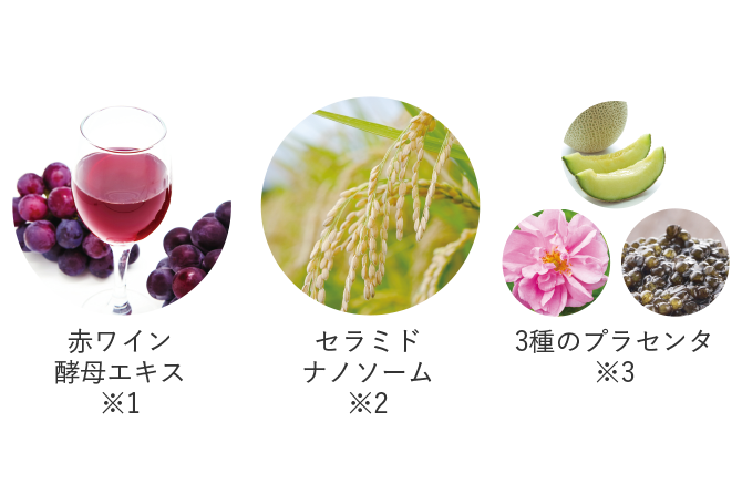 ※1 ブドウつるエキス、加水分解酵母エキス(皮膚コンディショニング成分) ※2 コメヌカスフィンゴ糖脂質(皮膚コンディショニング成分) ※3 ダマスクバラ胎座培養エキス、加水分解チョウザメ卵巣膜エキス、メロン胎座エキス(全て皮膚コンディショニング成分)