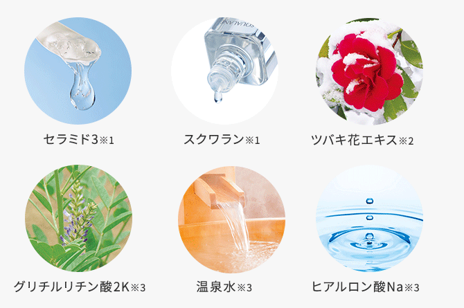 水、グリセリン、BG、ペンチレングリコール、スクワラン、ミリスチル3-グリセリルアスコルビン酸、グリチルリチン酸2K、セラミド3、ヒアルロン酸Na、ツバキ花エキス、温泉水、ジラウロイルグルタミン酸リシンNa、水添レシチン、コレステロール、メチルグルセス-10、プロパンジオール