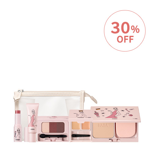 HABAでファンデーションを購入するのは初めてで、色白の方なので少し心配でしたが、ちょうど良い色で、シミを隠せるコンシーラーセット、眉とアイシャドーのセットもお揃いの柄でテンション上がりました。ポーチはシンプルで濡れても大丈夫な素材なのでお出かけの時に持ち歩くのにとても良いです。しいて言えば口紅の色が地味で私の年齢だと汚く見えたりするので、もっと綺麗な鮮やかな色、または、グロスだと良かったです。口紅の塗り心地は良いので違う色が欲しくなりました。