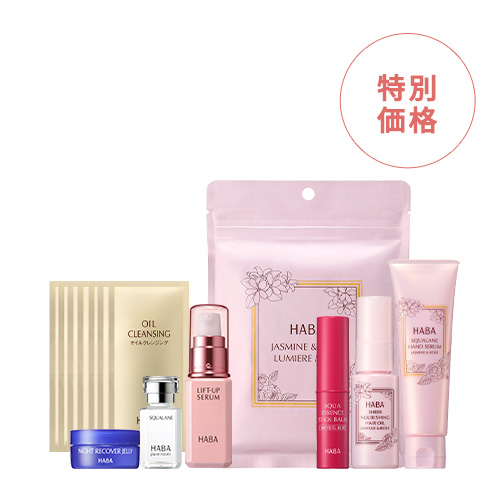 リフトアップセラムとスクワランの本品サイズの他、ナイトリカバージェリー(限定サイズ)や海の宝石 紅潤スティックなど乾燥の気になる時季に大活躍のアイテムが揃った充実のセットです。
