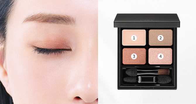 ナチュラルでありながらイキイキとヘルシーな表情に見せる、オレンジ系カラーのグラデーション。クリーミィアイボリー18を指でまぶた全体に薄くなじませた後、カフェラテベージュ08をブラシでアイホール全体にふんわりつけます。チップでオレンジブラウン01を目の際に入れ、仕上げにトゥインクルヴェール14をチップに取り、アイホールの中心にのせて、艶感をプラスします。