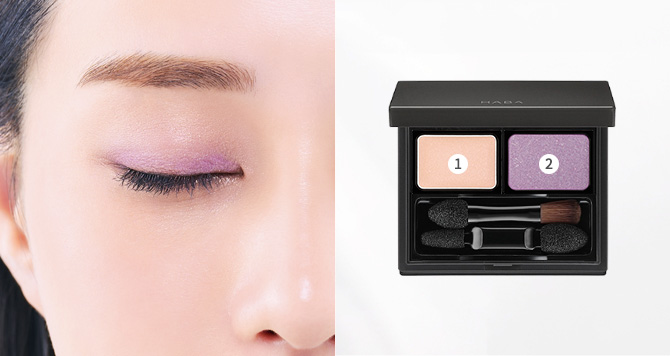 肌の透明感を引き立てるシンプルな組み合わせ。アイカラーベースのクリーミィアイボリー18を指にとり、まぶた全体に薄くなじませます。サテンライラック15をチップにとり、目の際に入れます。よりふんわり仕上げたい時は、ブラシを使ってつけるのもおすすめ。