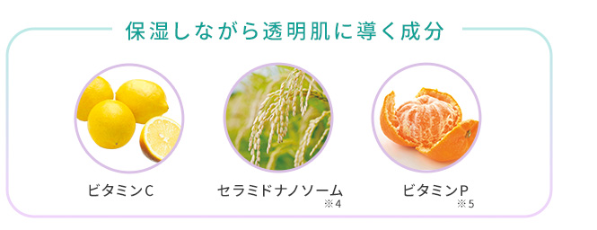 ※1 メラニンの生成を抑え、日やけによるシミ、ソバカスを予防 ※2 乾燥やキメの乱れによる ※3 リン酸L-アスコルビルナトリウム ※4 コメヌカスフィンゴ糖脂質(保湿成分)※5 グルコシルヘスペリジン(保湿成分)