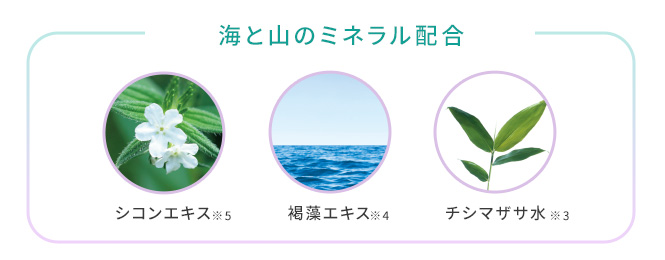 ※1 チシマザサ水、褐藻エキス(ともに保湿成分)、海塩(皮膚コンディショニング成分) ※2 乾燥による ※3 チシマザサ水(保湿成分) ※4 褐藻エキス(保湿成分) ※5 ムラサキ根エキス(皮膚コンディショニング成分)