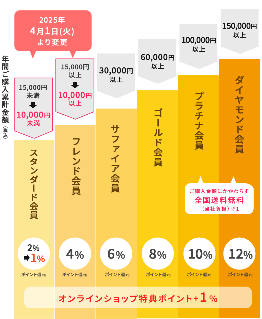 ● 4月1日のステージ決定後から毎月月末までのご購入累計金額が次のステージ基準に達した場合は、翌年4月1日を待たず金額達成の翌月からステージアップします。